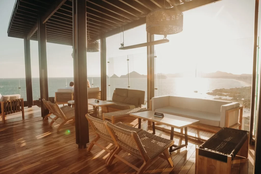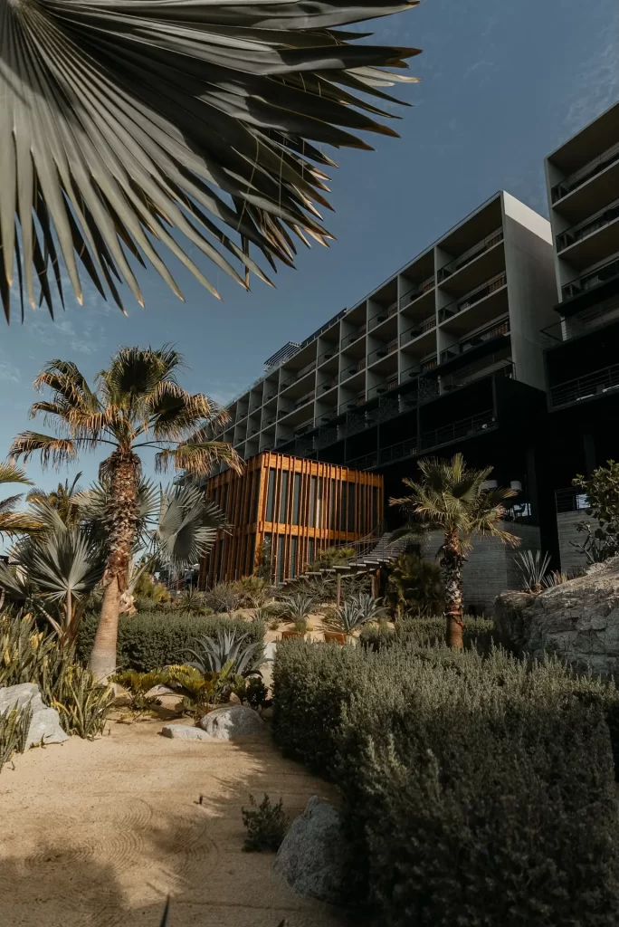 Enclavado sobre las dunas doradas de la playa Monumentos —uno de los secretos mejor guardados para surfistas—, The Cape no es solo un hotel, sino una experiencia inmersiva. Su arquitectura, concebida por el aclamado arquitecto mexicano Javier Sánchez, fusiona líneas modernas con materiales naturales de la región, generando una conexión constante entre el paisaje y la estructura. Paredes de concreto expuesto, detalles de madera, amplias terrazas abiertas al mar y el uso de piedra natural son elementos que rinden homenaje al entorno sin sacrificar la sofisticación. Cada una de sus habitaciones, suites y villas está diseñada para enmarcar la vista al océano, con ventanales de piso a techo que convierten cada amanecer en un espectáculo privado.